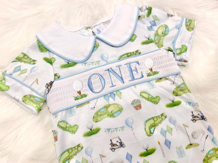 Golf First Birthday Smocked Romper: Boys Hole in ONE Par Tee Outfit