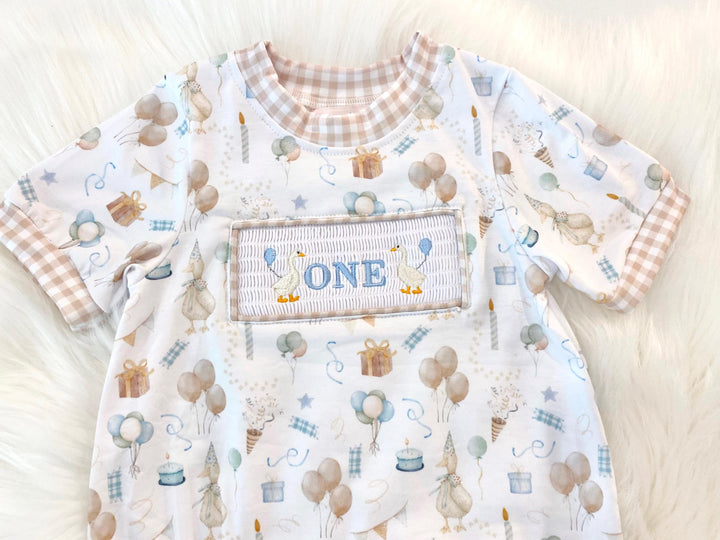 One Silly Goose 1st Birthday Smocked Romper: Baby Boy Outfit