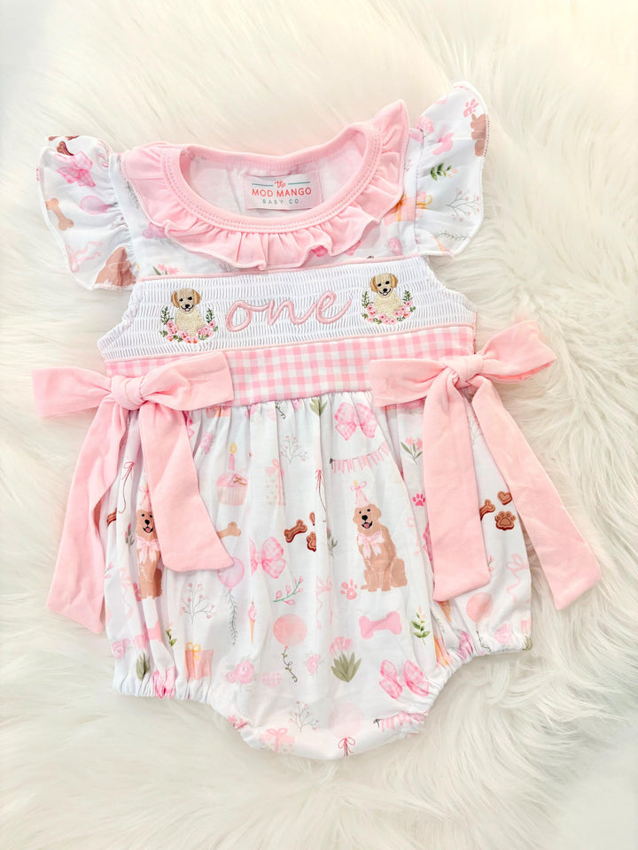 First Birthday Smocked Bubble Romper: Girls Pink Gingham Puppies and Bows, One Golden Year