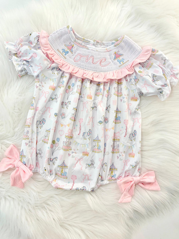 Carousel First Birthday Smocked Romper, First Go Round Embroidered Outfit
