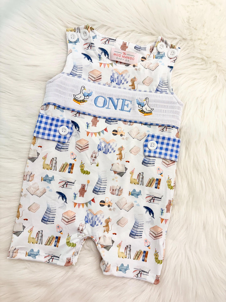 One For the Books Smocked Romper: Baby Boys First Birthday Outfit