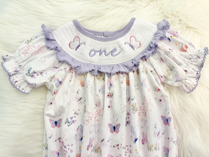 One Year Fluttered By Butterfly First Birthday Romper: Girls Smocked Lavender Outfit