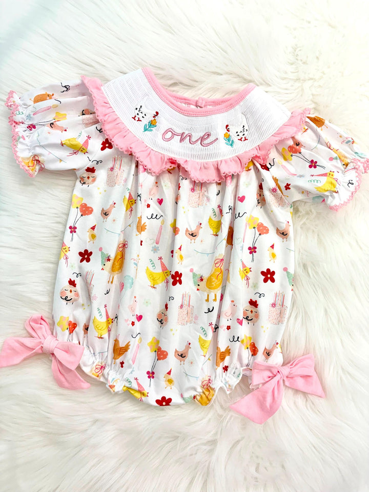 One Cute Chick 1st Birthday Smocked Romper: Pink Ruffles and Bows