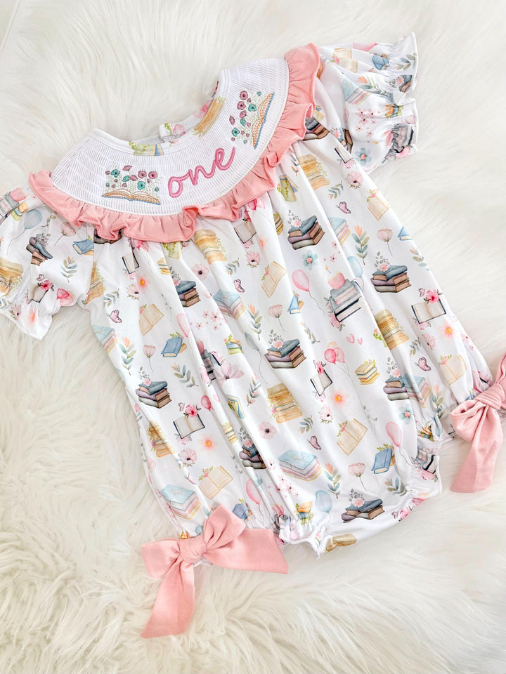 One for the Books First Birthday Romper: Girls Smocked Pink Floral Outfit