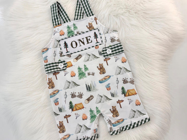 One Happy Camper First Birthday Outfit: Boys Smocked Romper Overalls