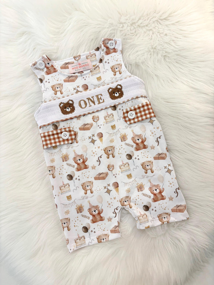 Teddy Bear First Birthday Smocked Romper: Beary 1st Neutral Baby Boy Outfit