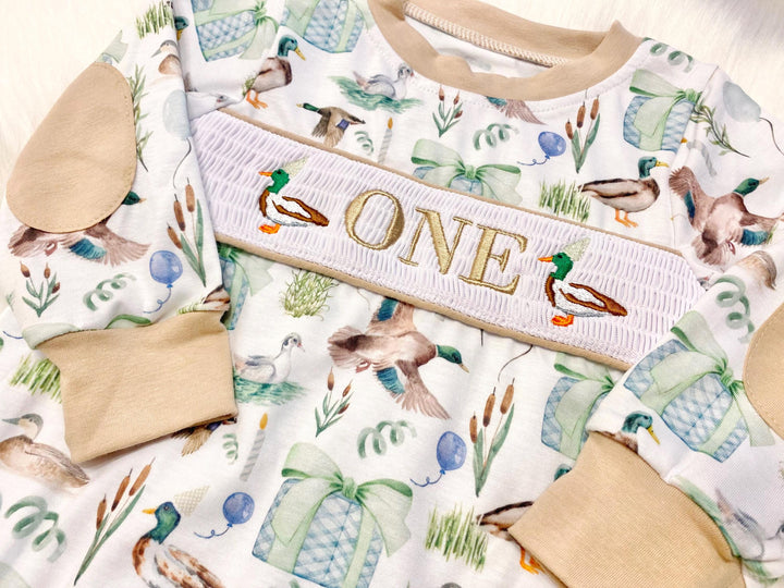 Mallard ONE Lucky Duck First Birthday Boy Outfit Smocked Bubble Romper