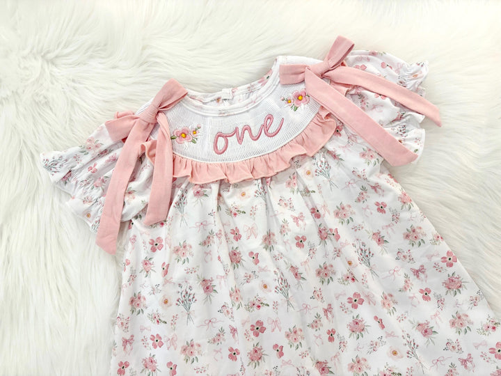 One for the Books First Birthday Romper: Girls Smocked Pink Floral Outfit