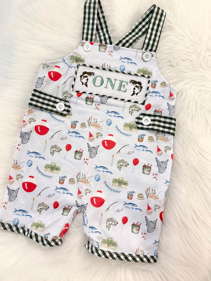 Ofishally One 1st Birthday Smocked Romper: Boys Fishing Theme Outfit