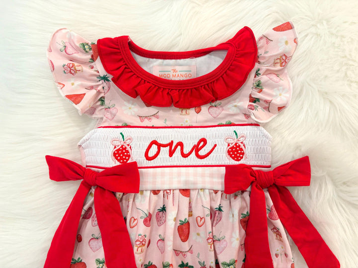 Strawberry First Birthday Smocked Romper: Berry 1st Baby Girl Outfit