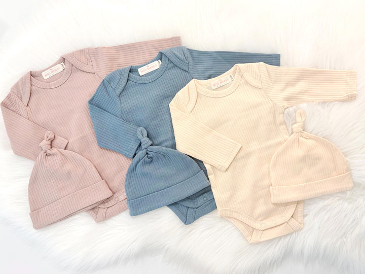 Organic Ribbed Cotton Newborn Outfit: Bodysuit and Knotted Hat Set