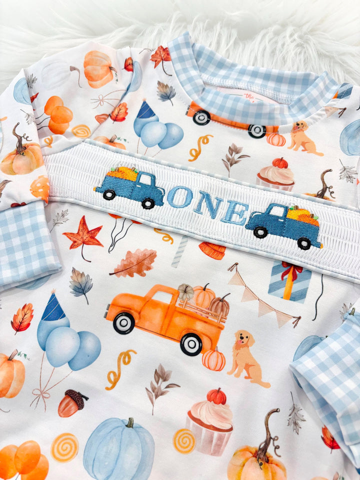 Our Little Pumpkin is ONE First Birthday Boy Outfit Smocked Bubble Romper Sweatshirt