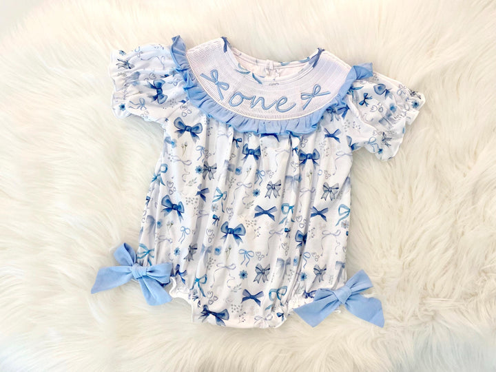 Blue Bow Smocked First Birthday Romper: Girls Coquette Outfit