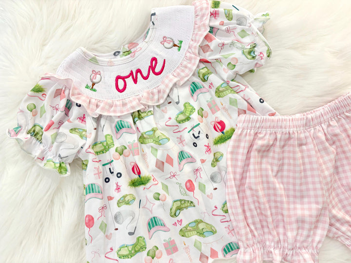 Hole in ONE Golf 1st Birthday Outfit: Girls Smocked Shirt and Bubble Shorts