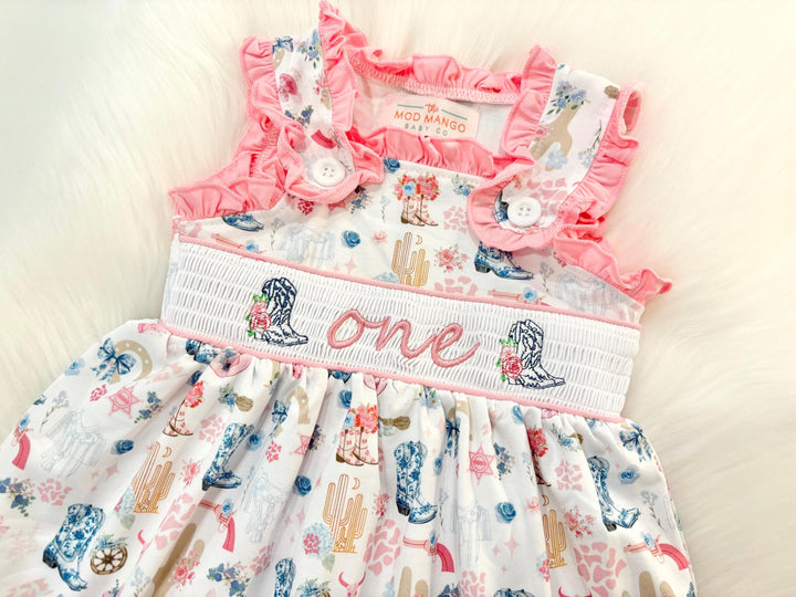 First Rodeo Smocked Birthday Dress: Girls Cowgirl 1st Birthday Outfit