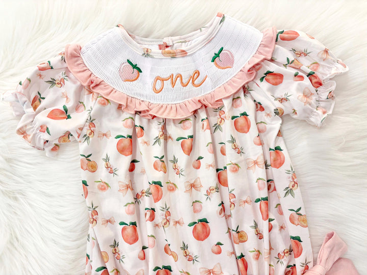 One Sweet Peach First Birthday Romper: Girls Smocked Bow Outfit
