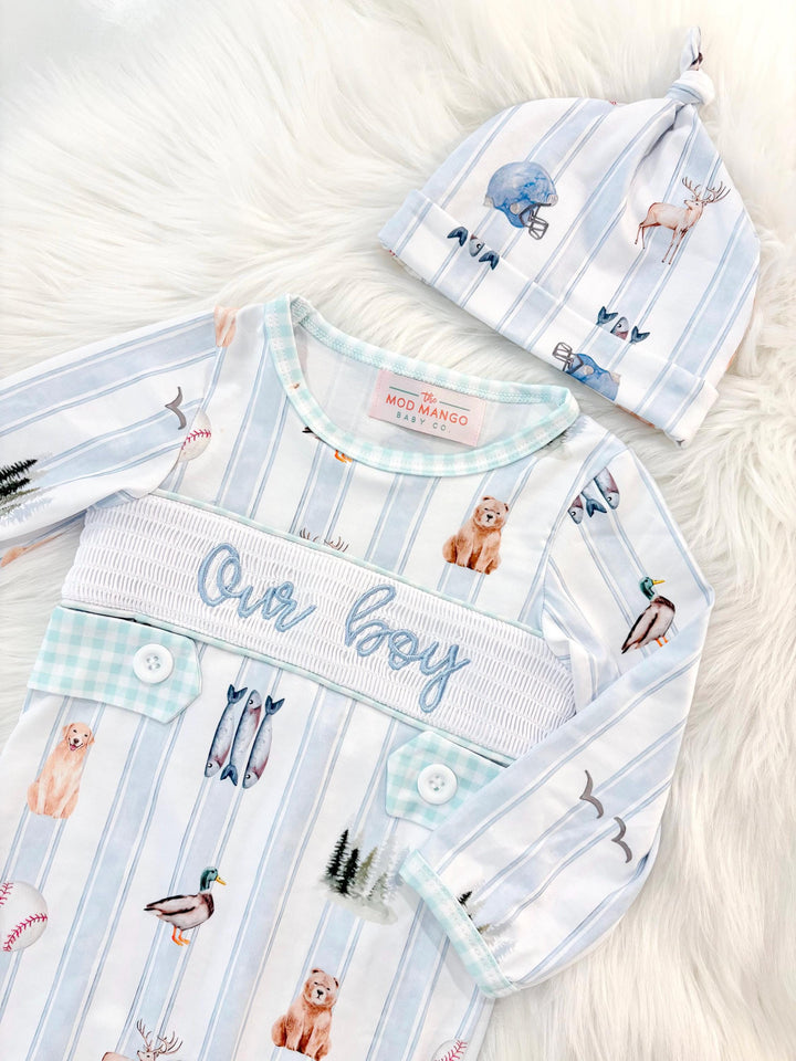 Newborn Boy Smocked Romper & Hat Set: Blue Stripe, 'Our Boy' Embroidery